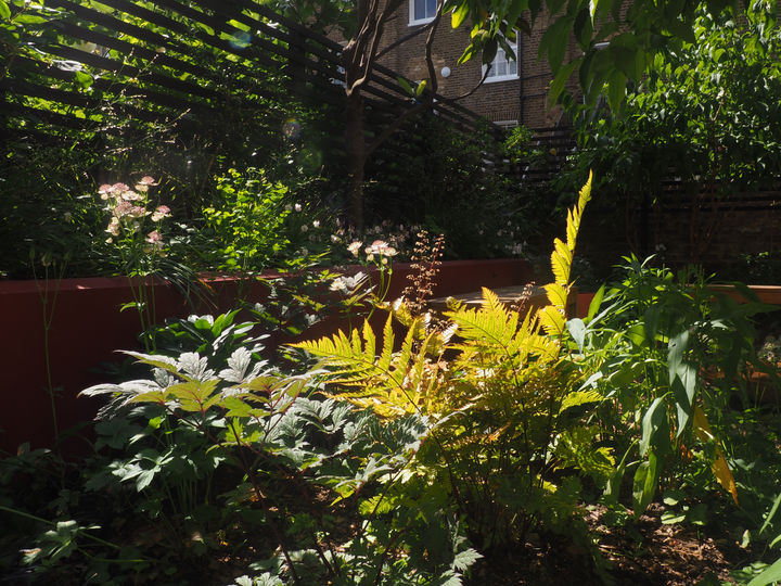 With a handsome Sycamore casting shadow from a neighbour's garden, the goal was to open up the planting and bring in light. A sunken gravel seating area was devised - bang in the centre of the garden - to allow for a fully immersive experience. Plants that enjoyed the woodland floor were introduced. From the centre the two sculptural multi-stemmed Heptacodium trees deliver a woodland understory.